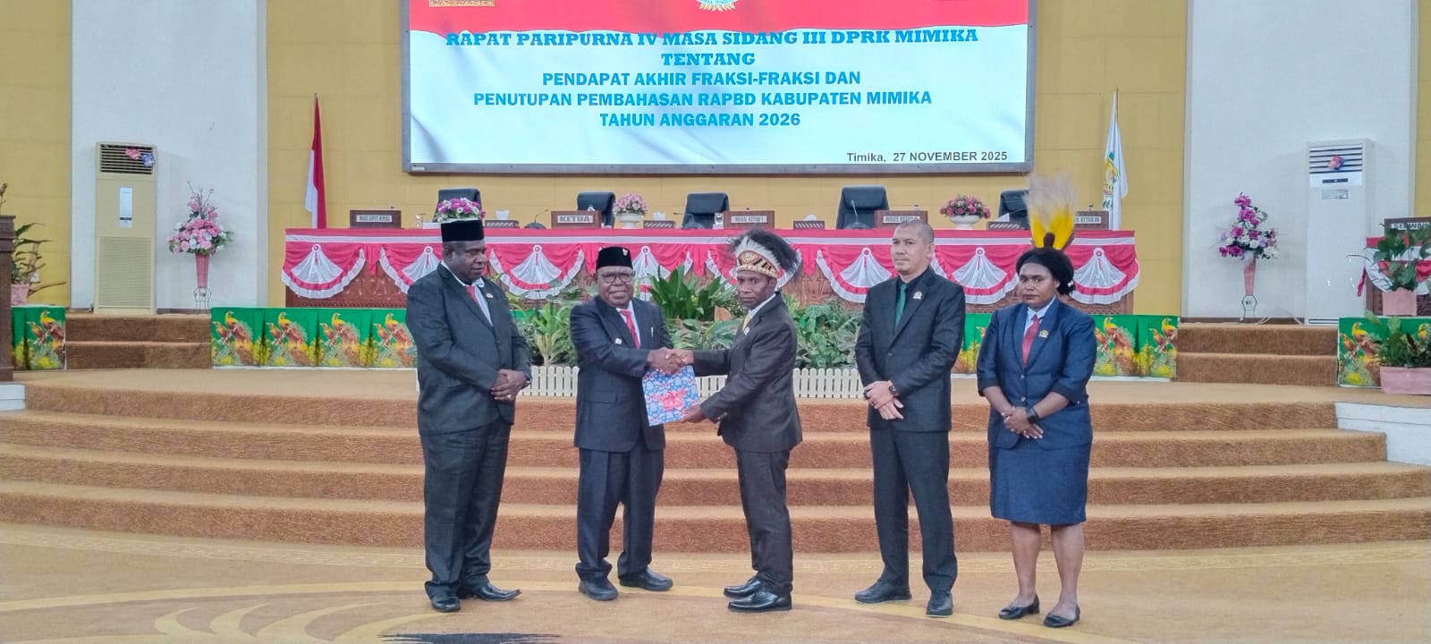 Hadir saat paripurna penetapan Wakil Bupati Mimika, Emanuel Kemong, Pj Sekda Mimika Abraham Kateyau, pimpinan Organisasi Perangkat Daerah (OPD), Forkopimda, serta tamu undangan. Paripurna penetapan diawali dengan pendapat akhir delapan fraksi DPRK. Dalam pendapat akhir fraksi-fraksi, DPRD menerima RAPB meminta pimpinan dewan untuk menetapkan menjadi APBD 2026. Usai penetapan, dilanjutkan dengan penandatanganan Surat Keputusan oleh Pimpinan DPRD Mimika dan Wakil Bupati Mimika.