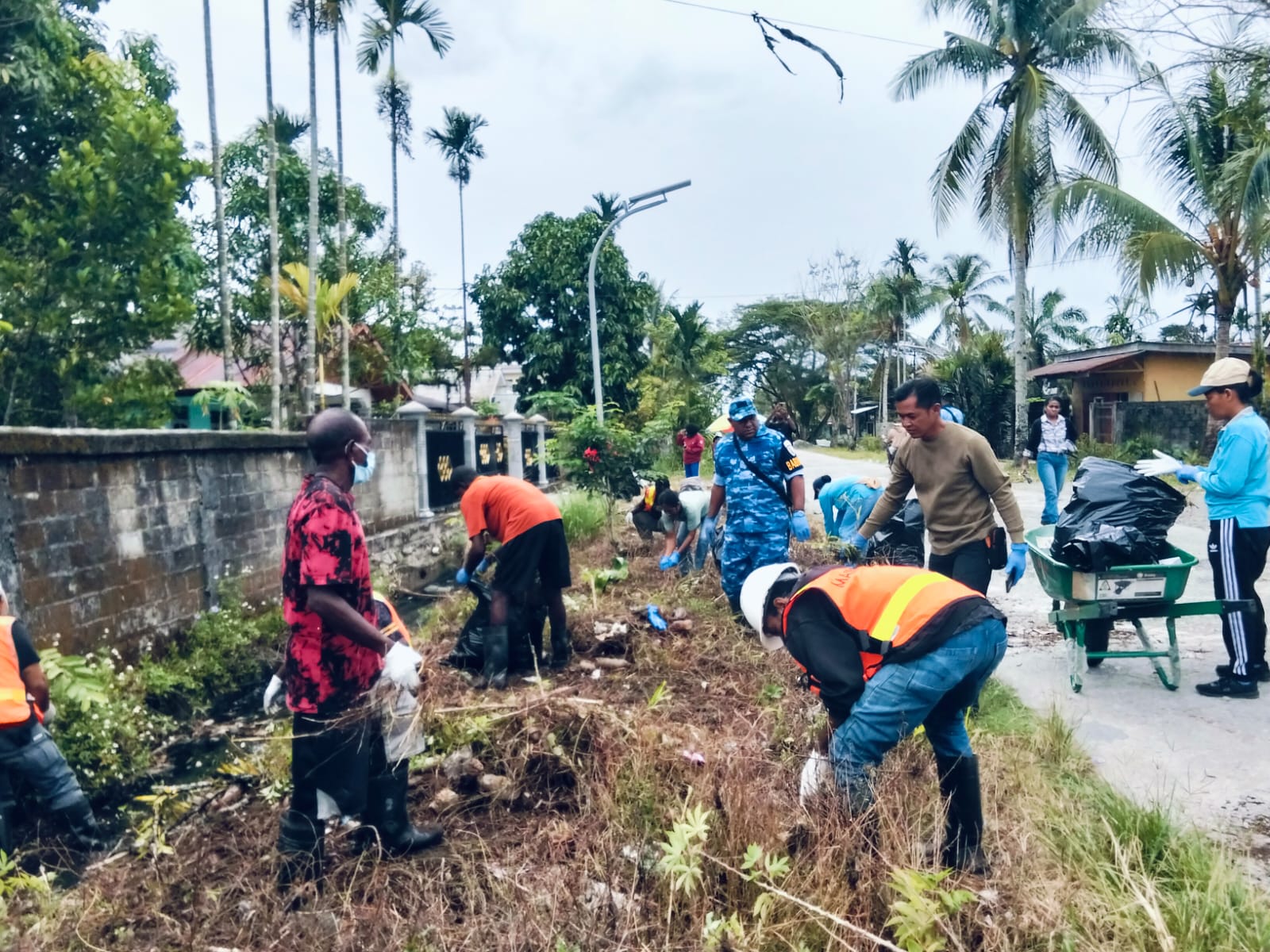 Suasana kebersamaan begitu terasa. Aparat kampung, personel TNI, tenaga CHD, tenaga kesehatan, serta warga setempat bergotong royong membersihkan lingkungan. Saluran air dibersihkan untuk mencegah genangan dan potensi penyakit, sampah-sampah dikumpulkan dan diangkut, rumput liar dipangkas, serta area sekitar permukiman ditata agar
