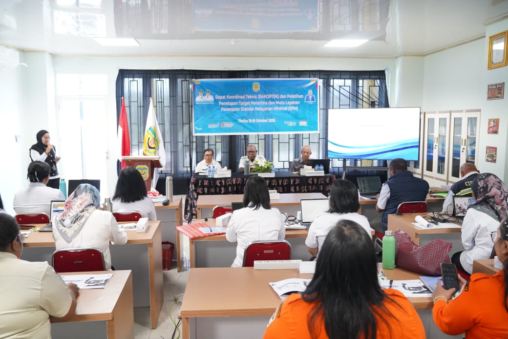 MPN – TIMIKA. Pemerintah Kabupaten Mimika melalui Bappeda menggelar Rapat Koordinasi Teknis (Rakortek) sekaligus Pelatihan Penetapan Target Penerima dan Mutu Layanan dalam Penerapan Standar Pelayanan Minimal (SPM), Rabu (15/10) 2025 di Ruang rapat Kantor Bappeda Mimika, Papua Tengah.