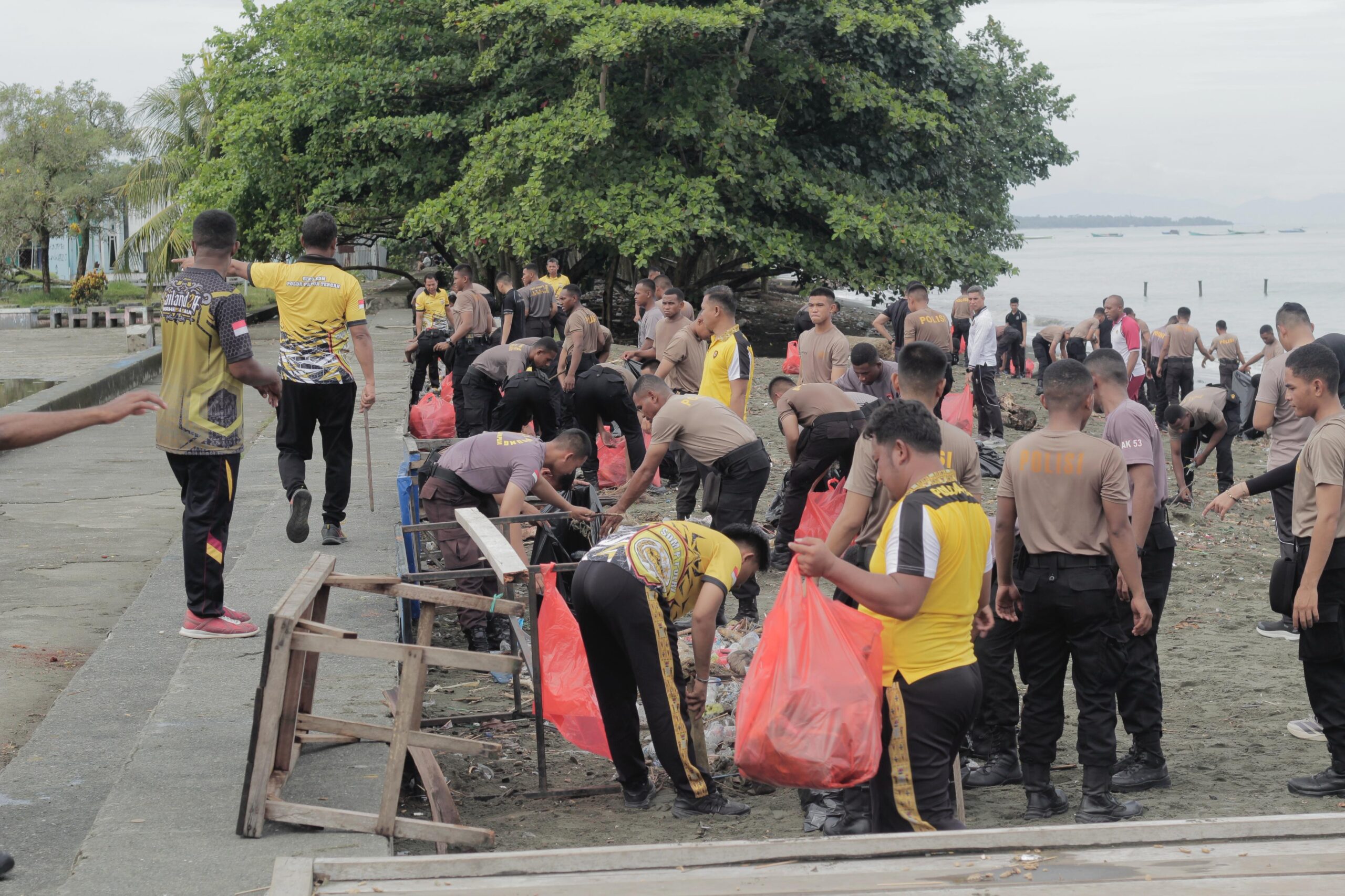 Aksi bersih pantai tersebut diikuti sejumlah pejabat utama dan personel kepolisian. Mereka menyisir sepanjang pesisir pantai untuk membersihkan sampah plastik serta limbah lainnya yang mencemari lingkungan.