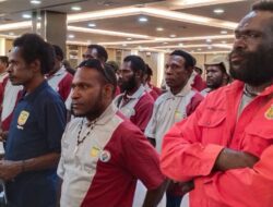 Peserta Pembinaan yang adalah Aparatur Pemerintahan Kampung di Kabupaten Mimika, saat pembukaan menyanyikan lagu Indonesia Raya
