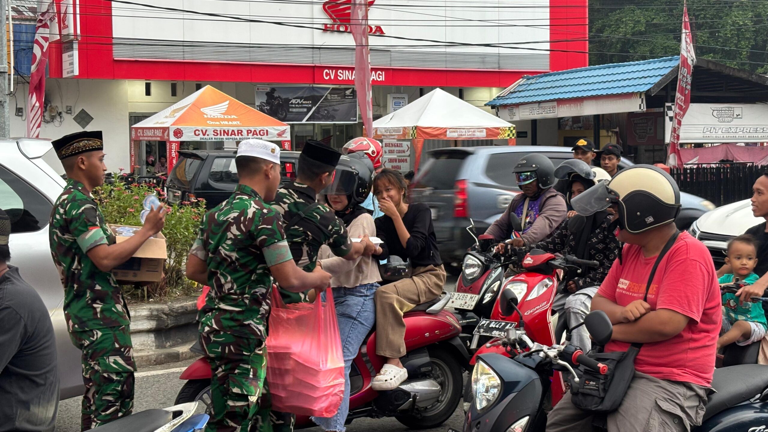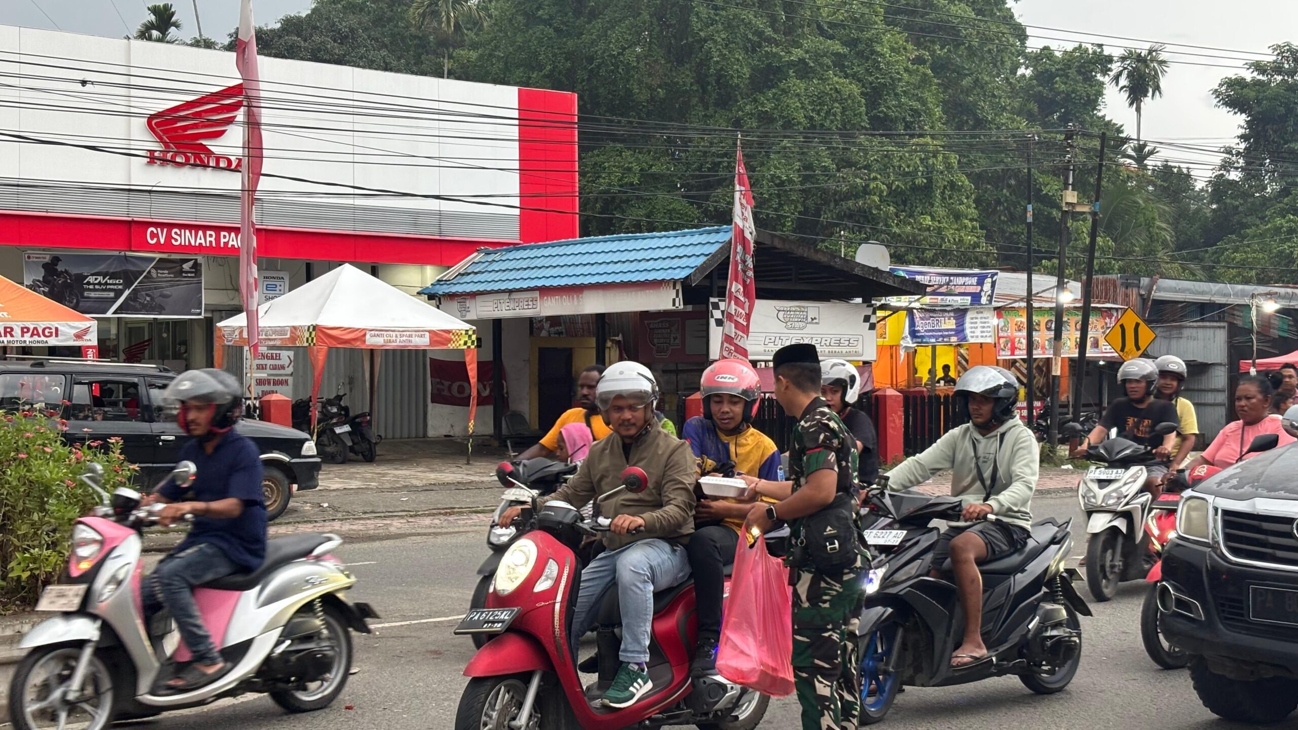 Nabire, MPN – Lalu lintas sore di Simpang Lampu Merah Kusuma, Nabire, mendadak jadi pusat perhatian, Jumat (20/2/2026). Di tengah padatnya kendaraan menjelang berbuka puasa Ramadan 1447 Hijriah, prajurit Yonif TP 804/DBAY turun langsung ke jalan membagikan takjil kepada para pengendara.