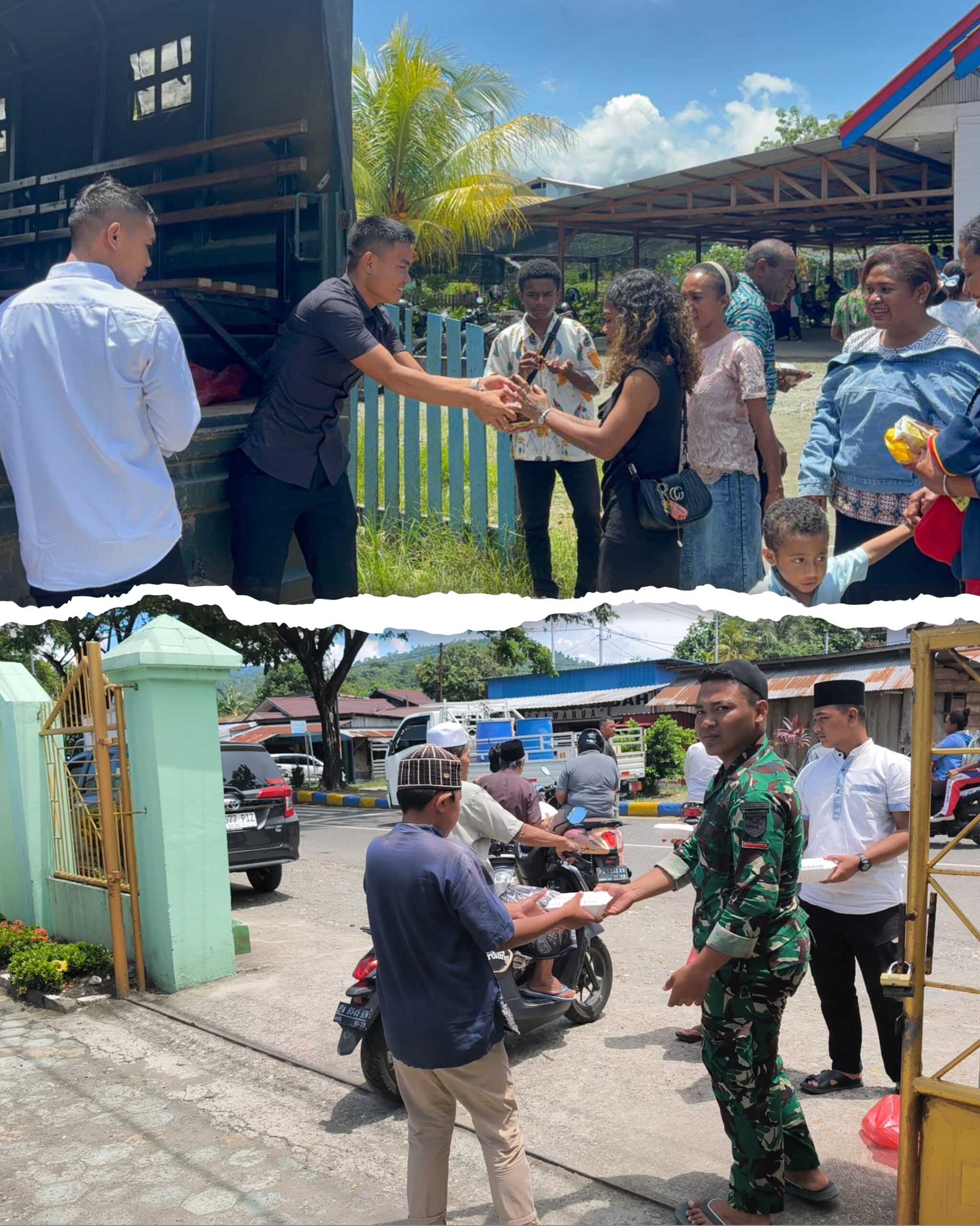 Sebelum kegiatan dimulai, personel Yonif TP 804/DBAY menyiapkan ratusan paket bantuan berupa nasi kotak, susu kotak, dan biskuit untuk dibagikan kepada jamaah. Bantuan disalurkan secara tertib di pintu masuk tempat ibadah usai pelaksanaan ibadah.
